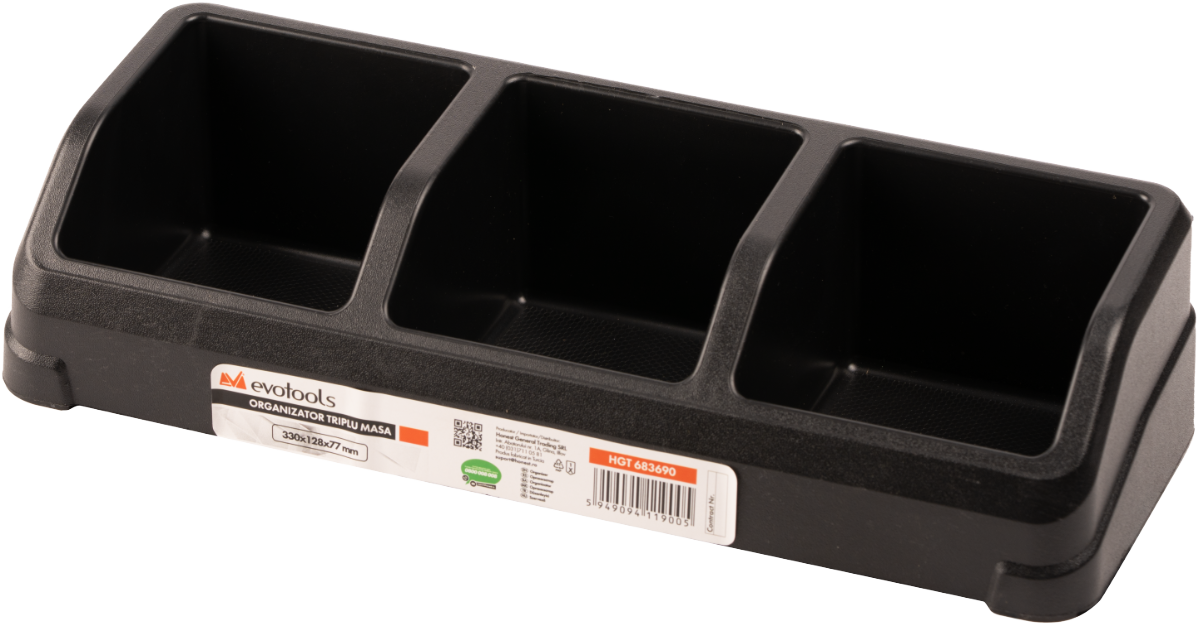 Organizator triplu de masă Evotools, fabricat din plastic rezistent, ideal pentru depozitarea și sortarea pieselor mici și accesoriilor. Designul cu trei compartimente independente permite organizarea eficientă și acces rapid la șuruburi, dibluri, cuie sau alte componente.