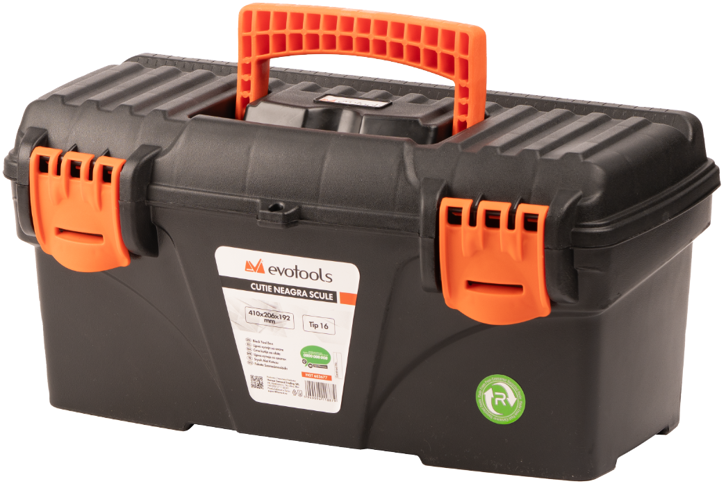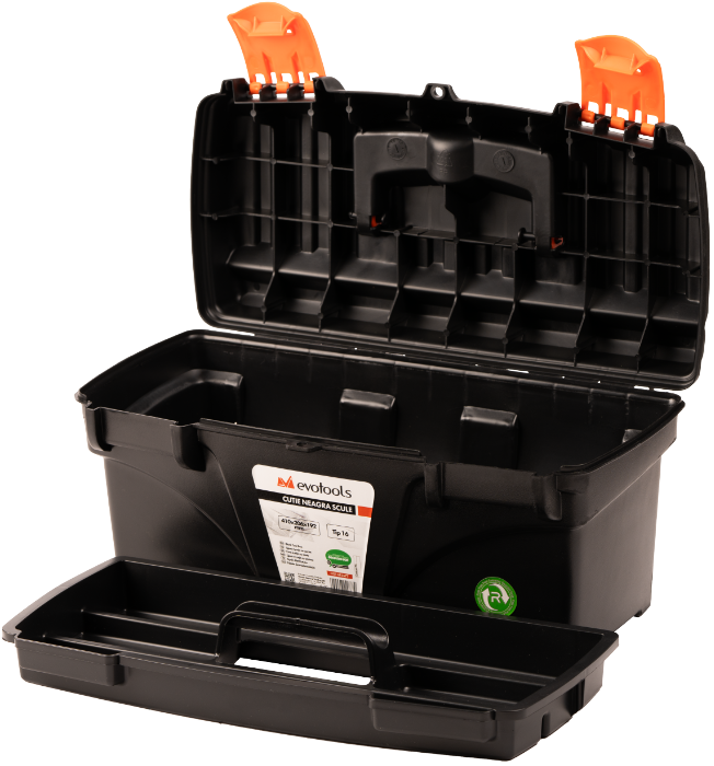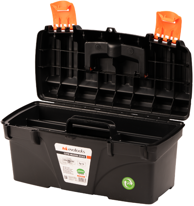 Cutie neagră pentru scule Evotools, realizată din plastic rezistent, ideală pentru depozitarea și transportul uneltelor. Compactă și practică, oferă organizare eficientă și protecție sculelor atât în atelier, cât și pe șantier