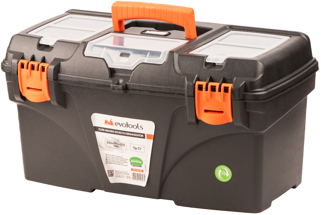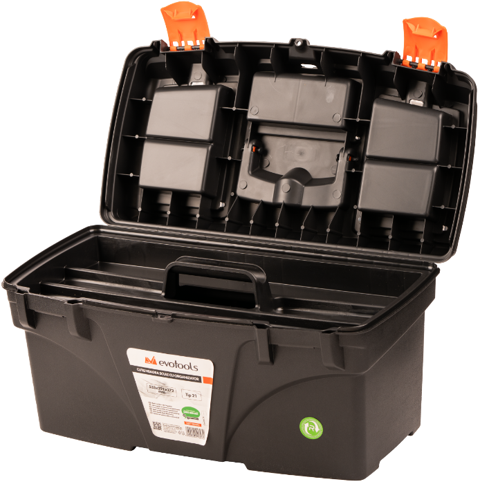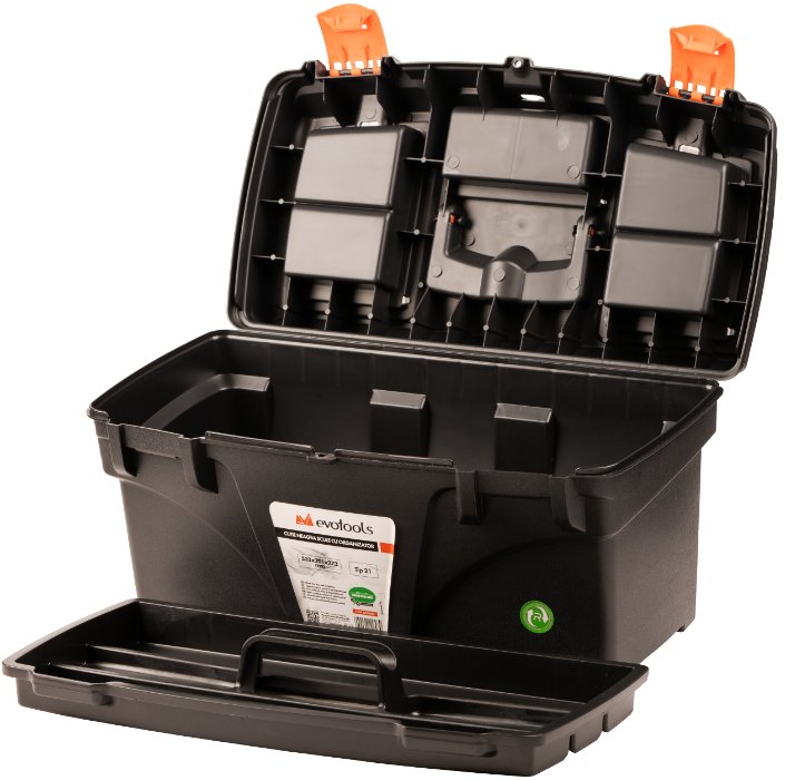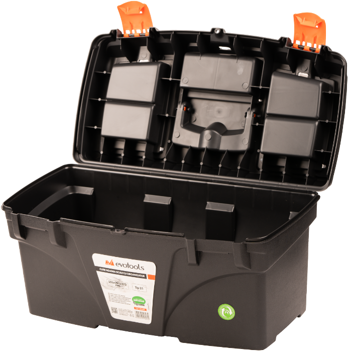Cutie neagră pentru scule Evotools, fabricată din plastic rezistent, prevăzută cu organizator practic pentru accesorii mici. Asigură depozitare sigură, transport ușor și organizare eficientă a sculelor în atelier sau pe șantier.