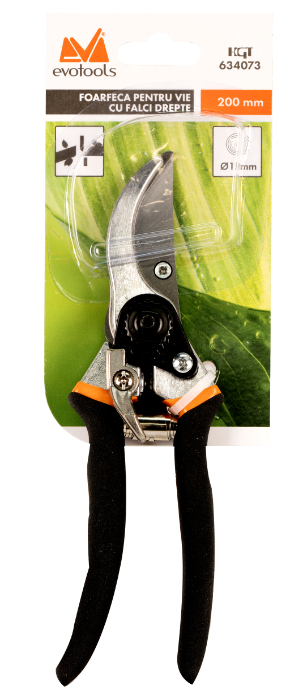Foarfeca pentru vie EvoTools are falcile taietoare, cu rozeta de reglarea a fortei de strangere, confectionate din otel carbon de inalta calitate, tratat termic, cu o duritate de 48-52 HRC. Manerele ergonomice confectionate din aluminiu acoperit cu policlorura de vinil (PVC) si arcul pretensionat va permit o priza optima, reducand riscul alunecarii, si o manevrare usoara in timpul utilizarii, pentru a putea taia cu usurinta ramuri cu diametrul de pana la 15 mm. Acest tip de foarfeca este proiectata pentru a efectua lucrari de ingrijire a gradinii sau a butasilor de vita de vie.